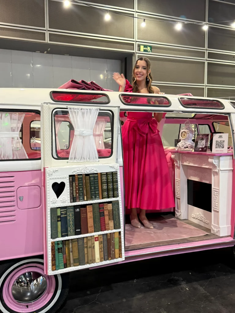 Dispone además de altavoz Bluetooth para reproducir la música que prefiera cada cliente, y su techo descapotable tipo fuelle permite disfrutarla tanto cerrada como al aire libre. Todo el interior ha sido decorado en tonos rosas y blancos personalizados, creando un ambiente mágico que enamora a primera vista.
